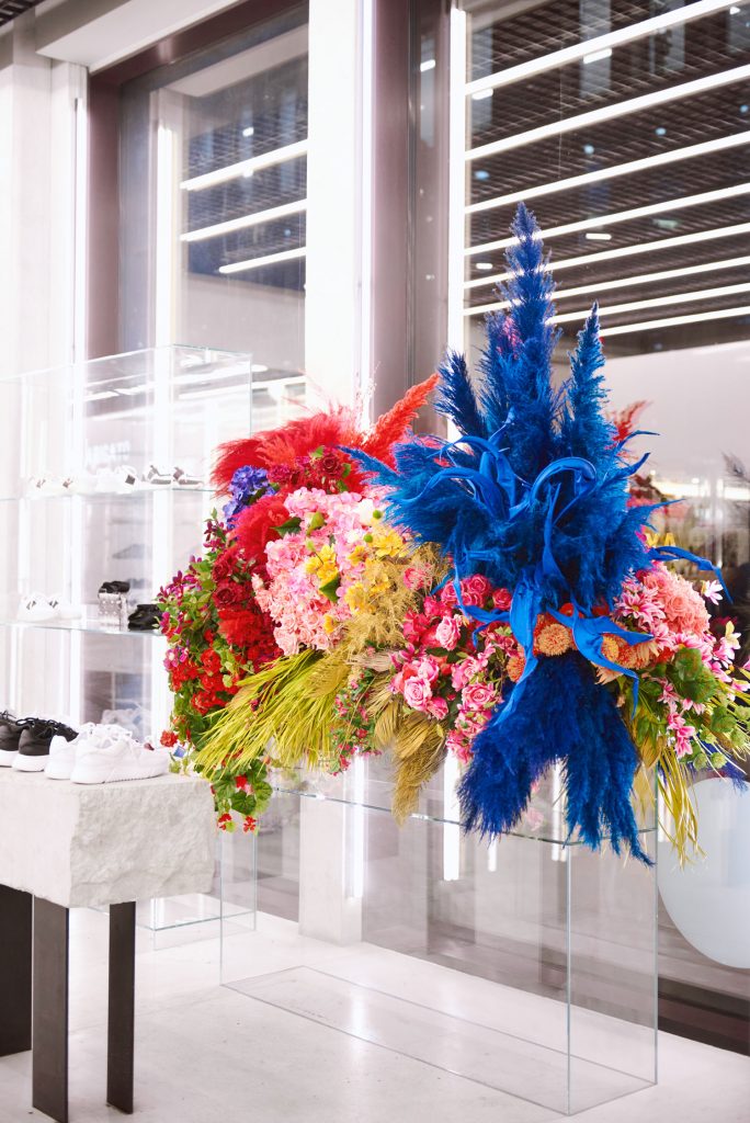 Responding to their brief and taking into consideration the window displays created by floral artists in their other stores, we filled two large glass tanks in the windows of their Soho store with large colourful floral explosions in our signature more-is-more style.