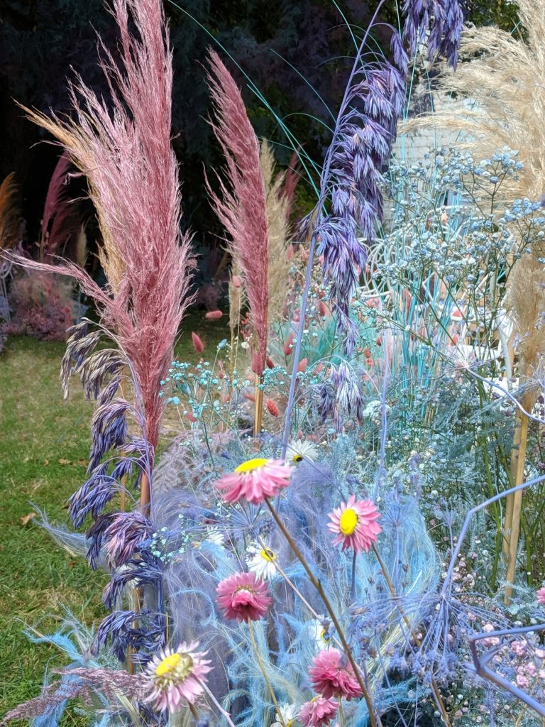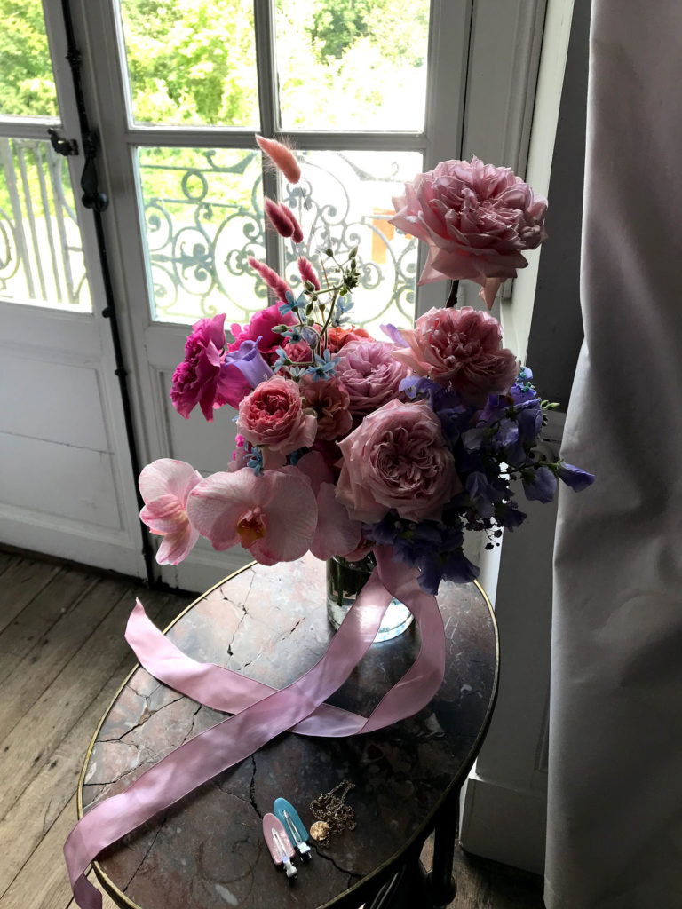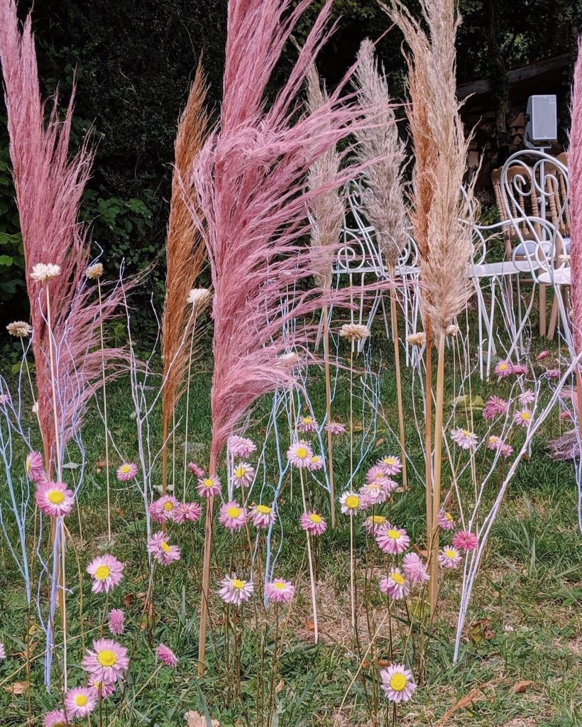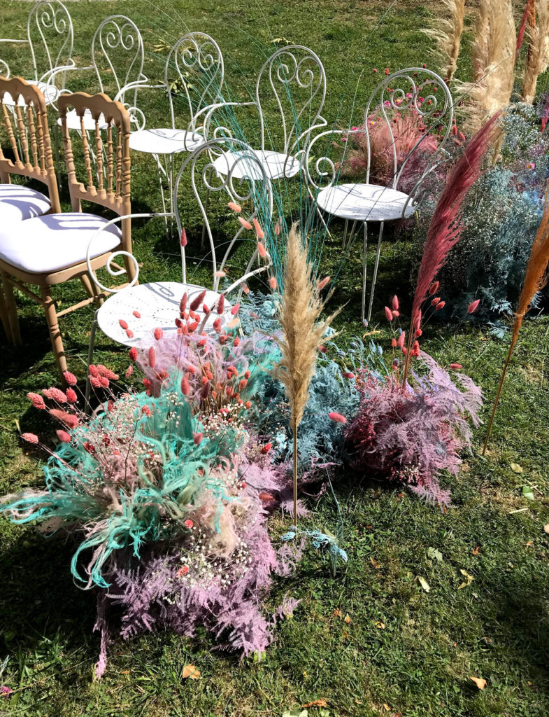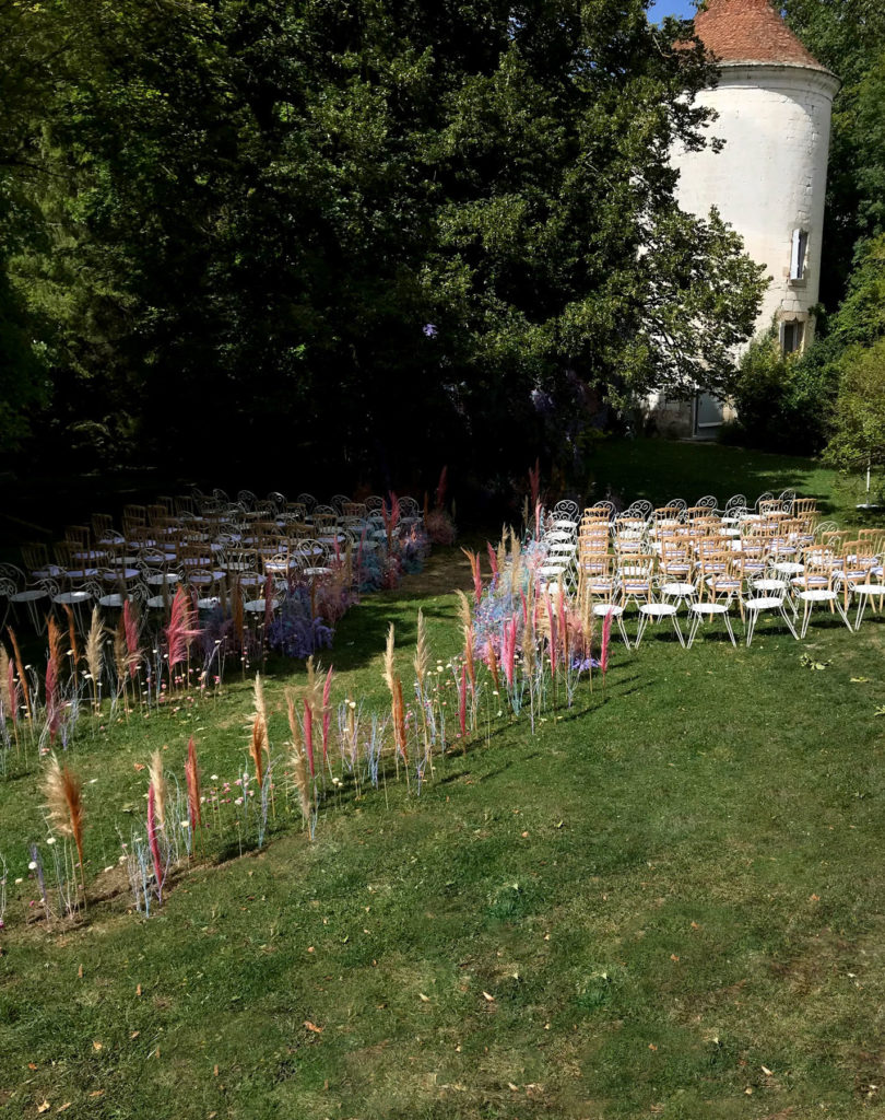 We created this dream destination wedding in France for and super fun and creative London couple. The ceremony was a twisting path of florals running through the grass in the grounds of the chateau, we individually planted pink daisy and pampas stems into the lawn building to a crescendo of asparagus fern.