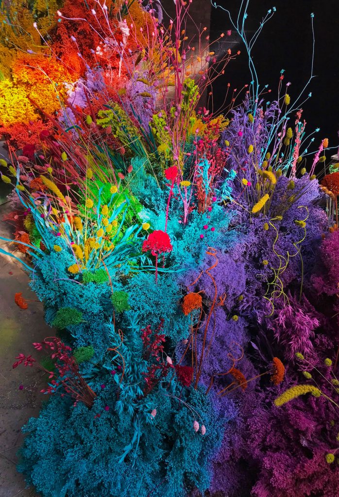 The design features a hanging sculpture of bright dried flowers interlaced with neon tube lights. The acrylic shapes represent shattered spectral light beams. Perfume bottles are displayed on fluorescent acrylic plinths elevating the small products within the window. Walls are clad in shiny yellow PVC