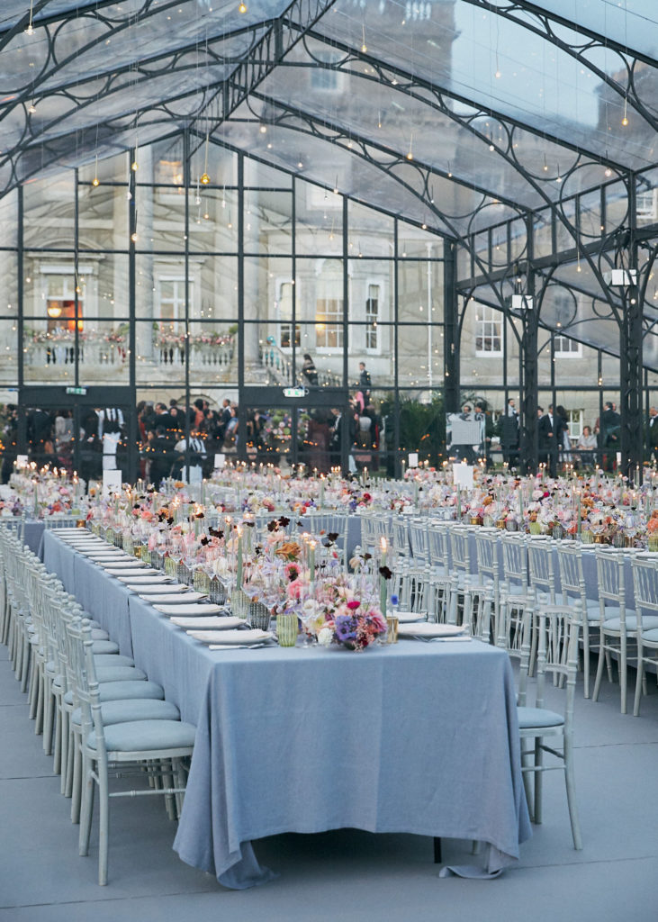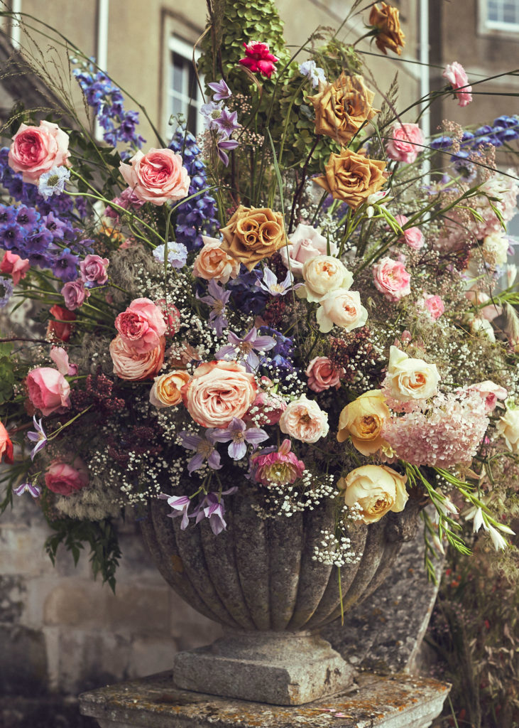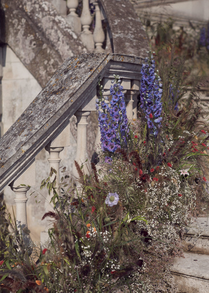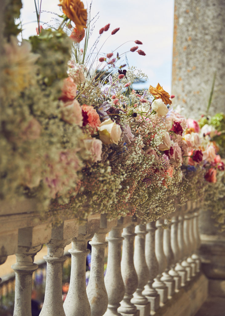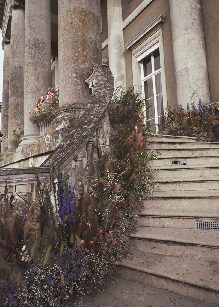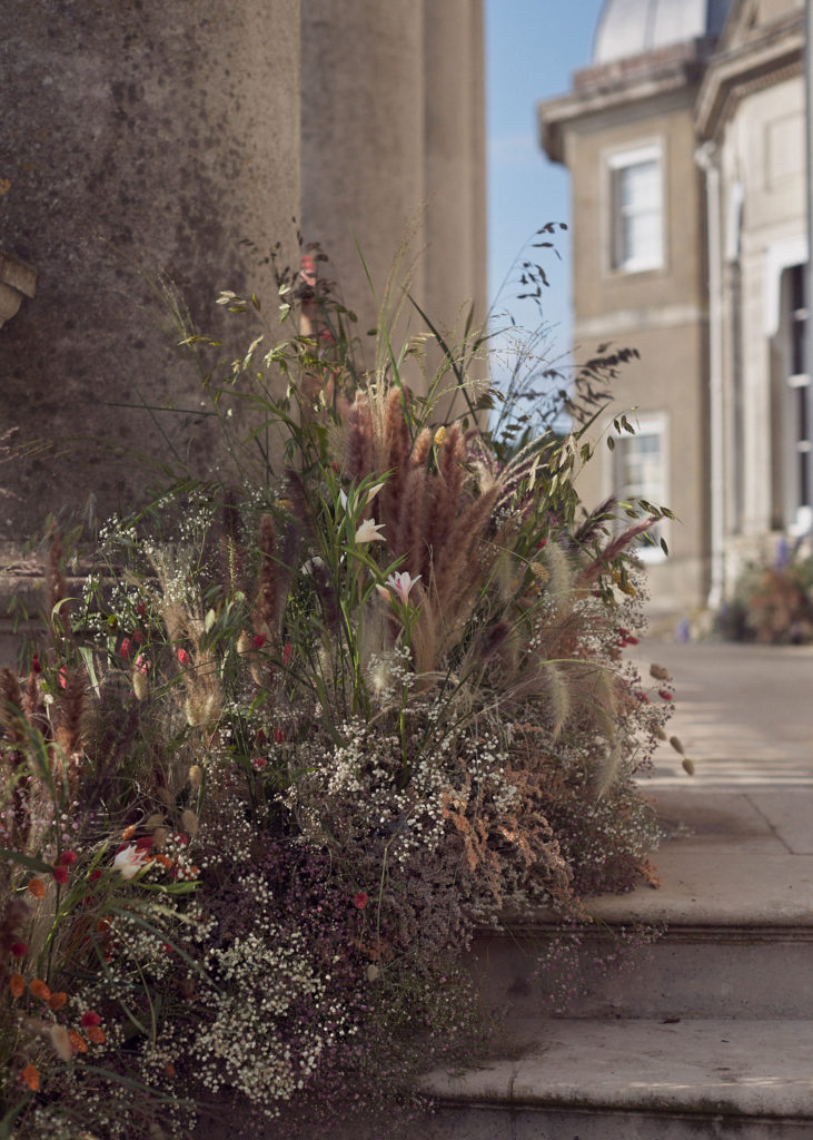 An English summer wedding set in the grounds of stately home Wrotham Park in Hertfordshire. My team and I created large floral installations throughout this beautiful venue. The stones steps and balustrade were flowered with a textured meadow leading from the inside of the house to the wedding reception in large glasshouse structure.