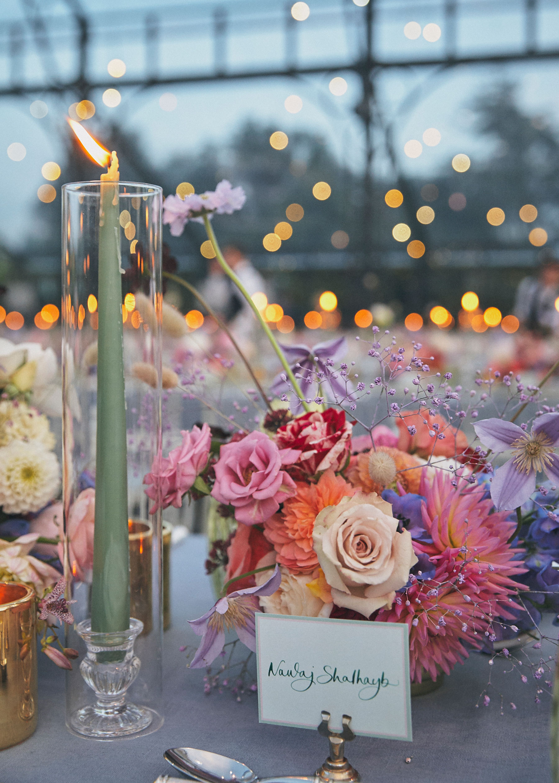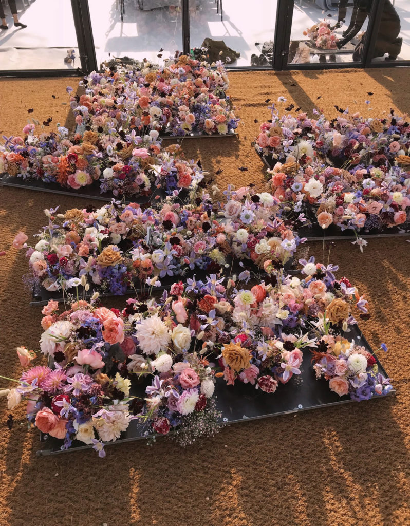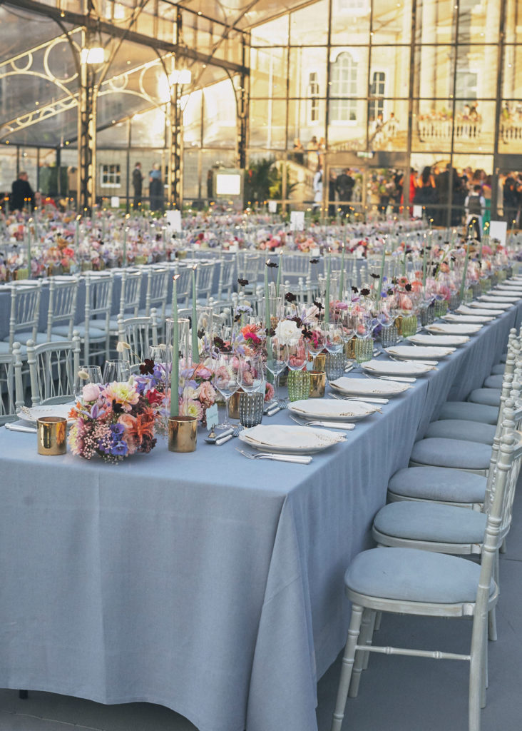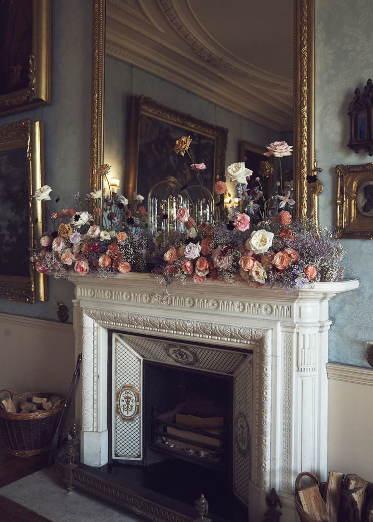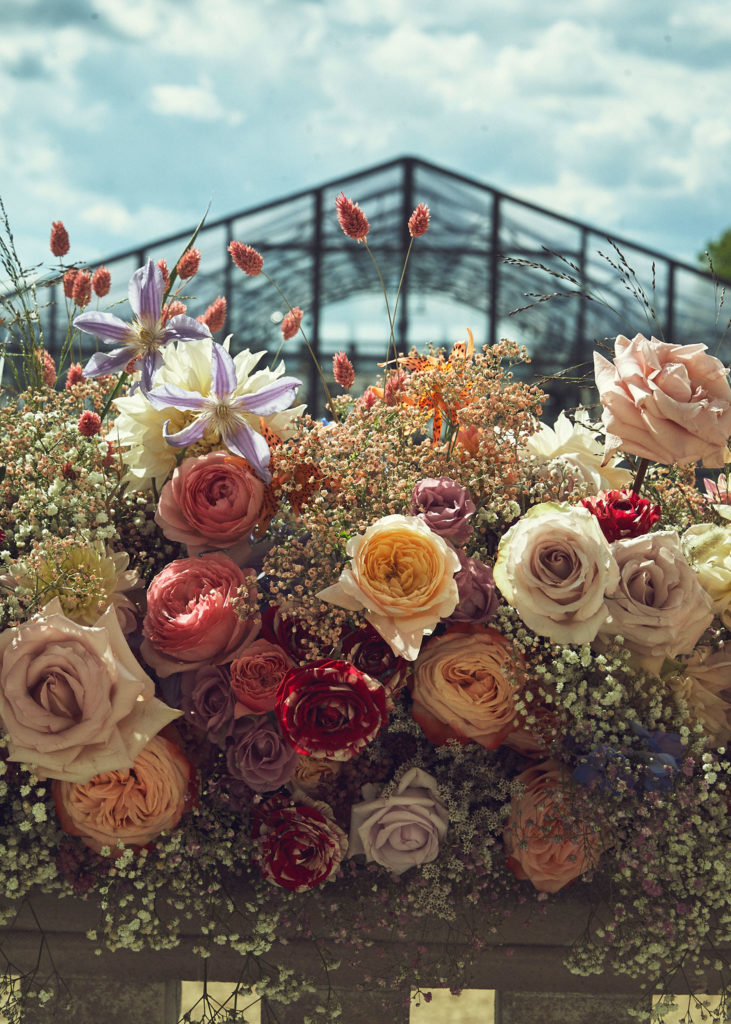 An English summer wedding set in the grounds of stately home Wrotham Park in Hertfordshire. My team and I created large floral installations throughout this beautiful venue. The stones steps and balustrade were flowered with a textured meadow leading from the inside of the house to the wedding reception in large glasshouse structure.